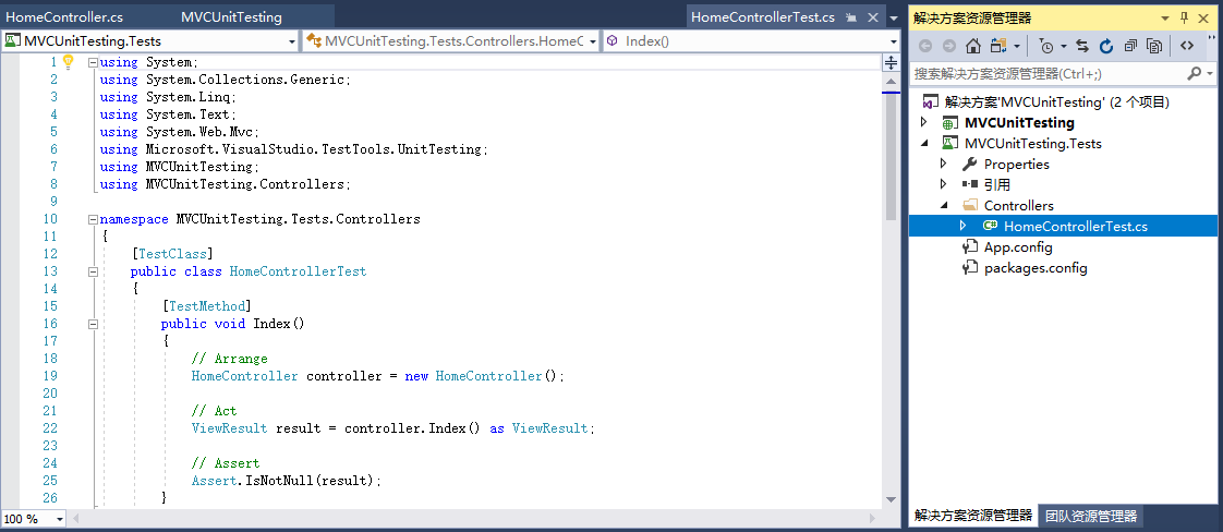 展開MVCUnitTestingDemo.Tests 項目,Controllers文件夾下的HomeControllerTest.cs文件。