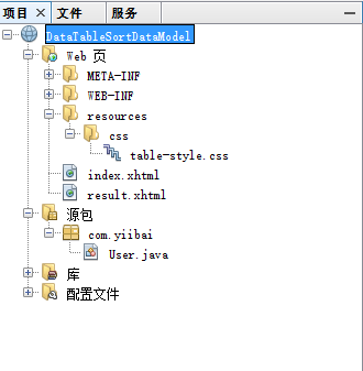打開 NetBeans IDE 創(chuàng)建一個Web工程:DataTableSortDataModel,其目錄結(jié)構(gòu)如下所示 -
