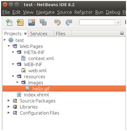 現(xiàn)在,您可以編寫如下代碼。 <h:graphicImage>標(biāo)簽指定名為hello.gif的圖像在目錄 pages/resources/images 中。