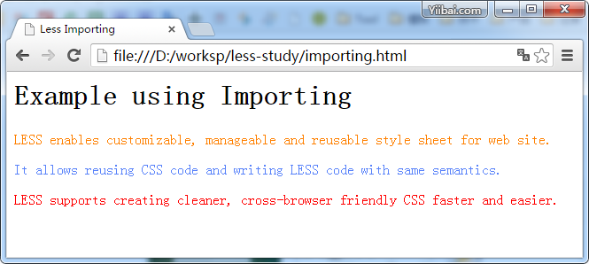 <html> <head> <title>Less Importing</title> <link rel="stylesheet" type="text/css" href="style.css" /> </head> <body> <h1>Example using Importing</h1> <p class="myclass">LESS enables customizable, manageable and reusable style sheet for web site.</p> <p class="myclass1">It allows reusing CSS code and writing LESS code with same semantics.</p> <p class="myclass2">LESS supports creating cleaner, cross-browser friendly CSS faster and easier.</p> </body> </html>