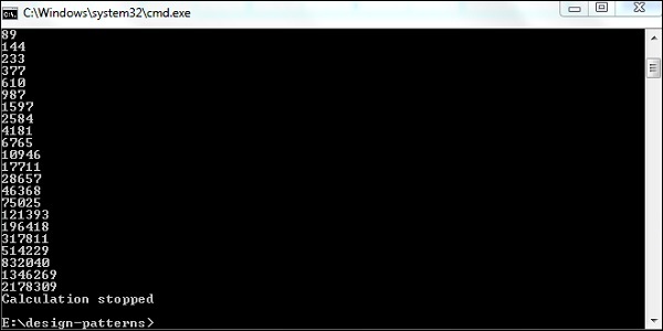 如果使用這個(gè)模式,則使用迭代器模式打印斐波那契數(shù)列。 強(qiáng)制終止用戶時(shí),打印以下輸出 -