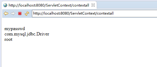 在編寫完成上述代碼后,部署這個Web應用,打開瀏覽器訪問URL: http://localhost:8080/ServletContext/contextall ,如果程序沒有錯誤,應該會看到以下結果 -