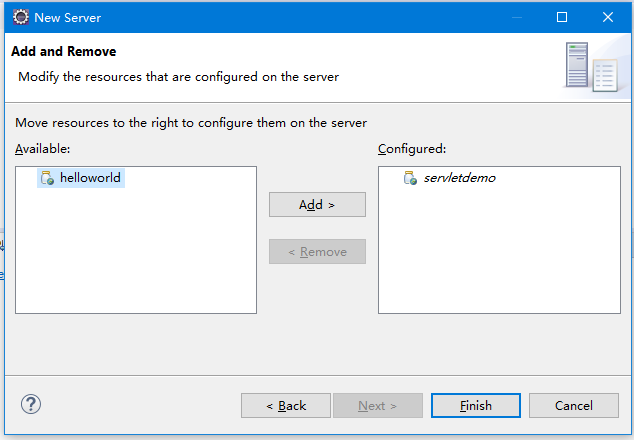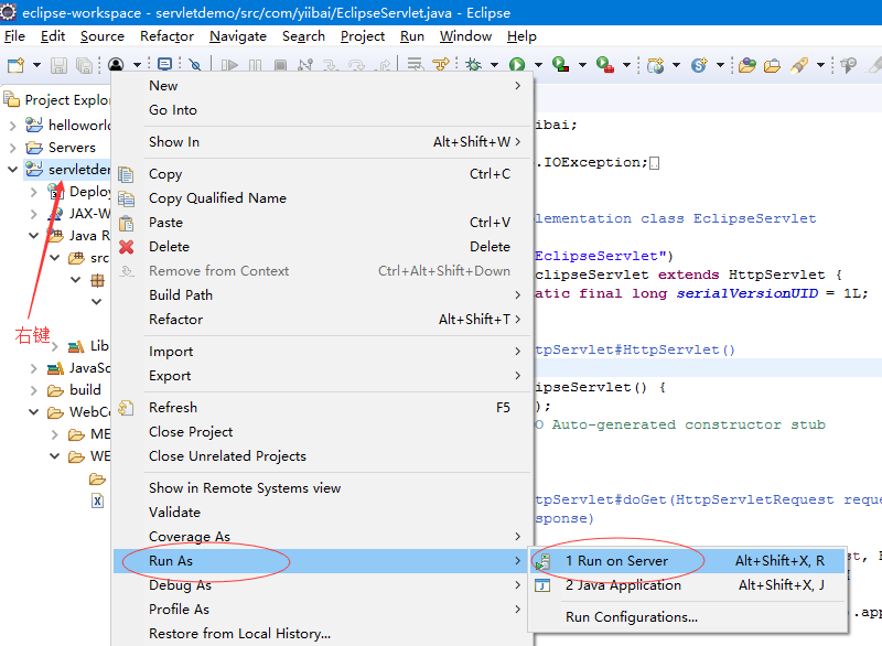 要啟動服務器并部署項目,首先右鍵單擊項目(servletdemo) -> Run As -> Run on Server -> 選擇tomcat服務器 -> 下一步 - > addAll -> 完成。