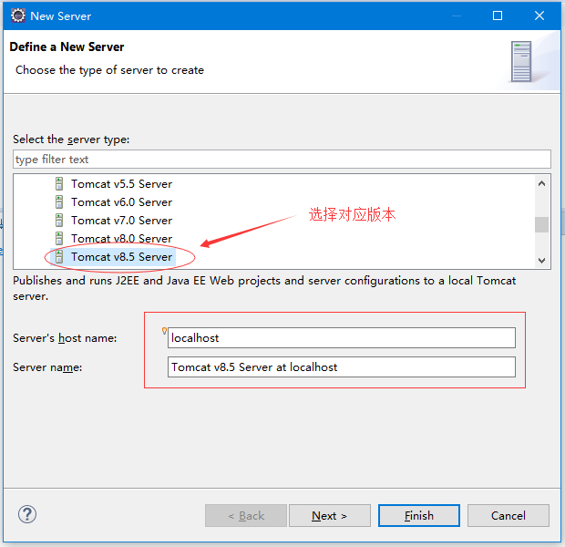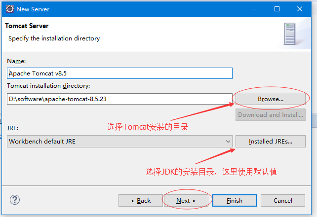 選擇Tomcat服務器的安裝目錄以及它的名稱,還要指定JRE配置,如下所示 -