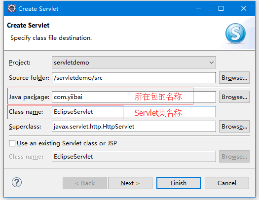 在彈出的向?qū)Э蛑?,填寫Servlet類和所在的包名稱,點擊下一步(Next>),如下圖所示 -
