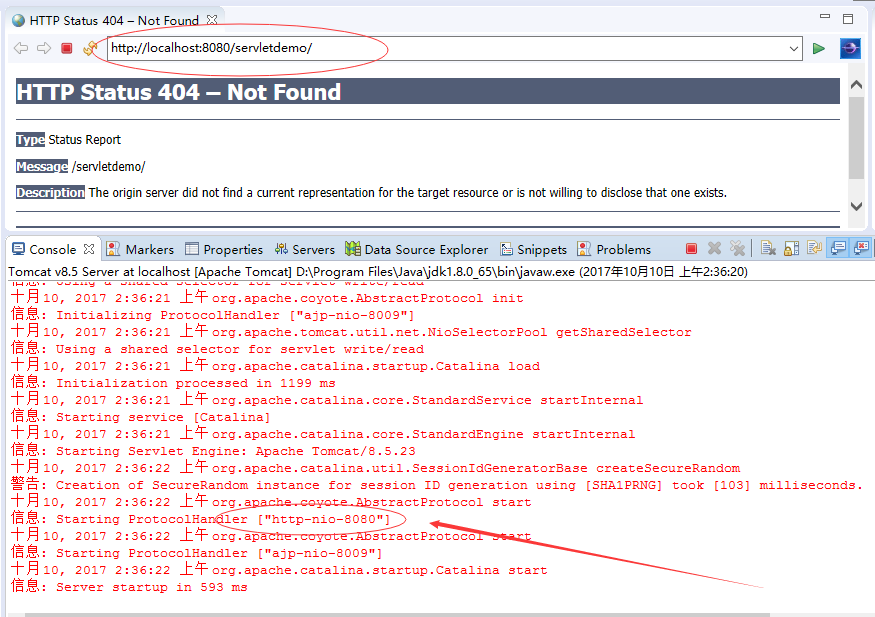 EclipseServlet,可查看EclipseServlet類定義前面定義的注解:@WebServlet("/EclipseServlet"),例如,修改為@WebServlet("/hello"),那么訪問對應的URL應為: http://localhost:8080/servletdemo/hello