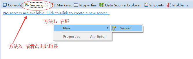 要在eclipse IDE中配置tomcat服務器,請單擊IDE底部的服務器(Server)選項卡 -> 右鍵單擊空白區(qū)域 ->新建(New) -> 服務器(Server) - >選擇Apache Tomcat,然后選擇其版本 -> 下一步(Next>) -> 單擊瀏覽按鈕 -> 選擇apache tomcat安裝目錄下的bin文件夾 -> 下一步(Next>) - > addAll -> Finish。可參考下面步驟和截圖來配置 -