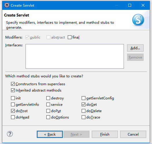 在彈出的界面中,勾選一些需要繼承的方法,然后點擊完成(Finish),如下圖所示 -