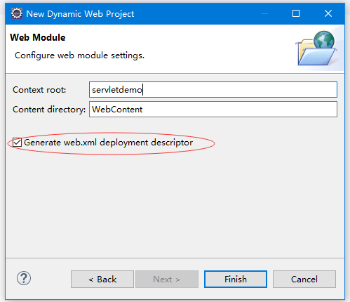 下一步,在彈出的向?qū)υ捒蛑?,填寫項目?nèi)容的根以及Web目錄名稱,這里使用默認值以及要打上勾選擇需要生成web.xml文件來配置部署描述符,點擊完成(Finished),如下所示 -
