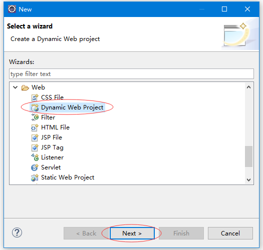在彈出的向?qū)υ捒蛑?,選擇 Web -> Dynamic web project ,然后點擊下一步(Next>),如下所示 -