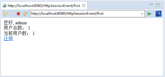 打開另一個瀏覽器訪問URL: http://localhost:8080/HttpSessionEvent/ ,登錄應(yīng)用,然后注銷,再次訪問: http://localhost:8080/HttpSessionEvent/first ,應(yīng)該看到以下結(jié)果 -