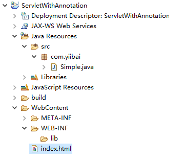 打開Eclipse,創(chuàng)建一個動態(tài)Web項目:ServletWithAnnotation,其完整的目錄結(jié)構(gòu)如下所示 -