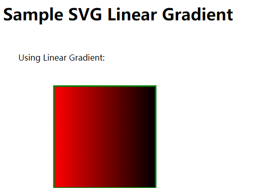 sampleGradient的一個<linearGradient>元素。linearGradient中,兩個偏移量用兩種顏色定義。rect元素中,在填充屬性中,指定漸變的URL以使用之前創(chuàng)建的漸變填充矩形。在Chrome瀏覽器中打開文件:testSVG.html,得到以下結(jié)果 -