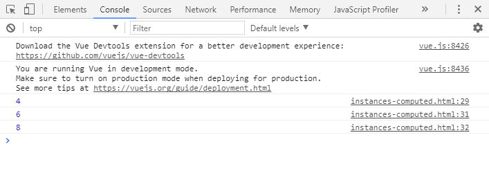 變量vm是Vue的一個實例,它調(diào)用aSquare和aSum函數(shù)。 另外vm.aSquare = 3從aSquare函數(shù)調(diào)用set函數(shù),vm.aSquare調(diào)用get函數(shù)。可以查看瀏覽器中的輸出,如下圖所示。