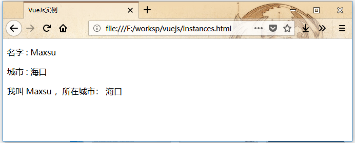 因此,在{{}}中的mydetails函數(shù)被調(diào)用。 Vue實例將函數(shù)返回的值打印在{{}}中。 下面在瀏覽器中打開上面創(chuàng)建的文件:instances.html ,查看效果如下 -