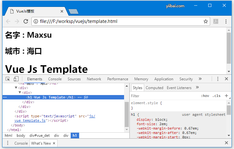 如果查看瀏覽器,我們會(huì)看到內(nèi)容的添加方式與在.js文件中定義的變量htmlcontent相同:"<div><h1>Vue Js Template</h1></div>"。