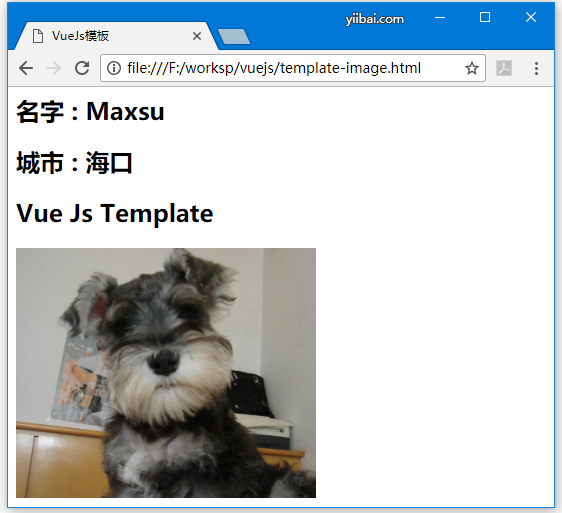 但是這樣做并不能顯示圖像。要將任何屬性分配給HTML標(biāo)簽,需要使用v-bind指令。 用v-bind指令將src添加到img標(biāo)簽中。這是在template-example1.html文件中分配的。參考以下代碼 -