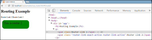 執(zhí)行示例并查看瀏覽器中的顯示。 在檢查和檢查路由器鏈路時(shí),發(fā)現(xiàn)它將類添加到活動(dòng)元素,如下面的截圖所示 -