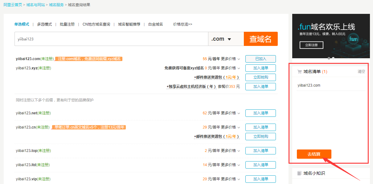 查詢你想要注冊的域名,比如:yiibai123.com,只需要輸入yiibai123搜索即可,為什么還要搜索?這是因為有的域名可能已經(jīng)被別人注冊了,只要別人還沒有注冊你都可以注冊。搜索結(jié)果如下所示 -