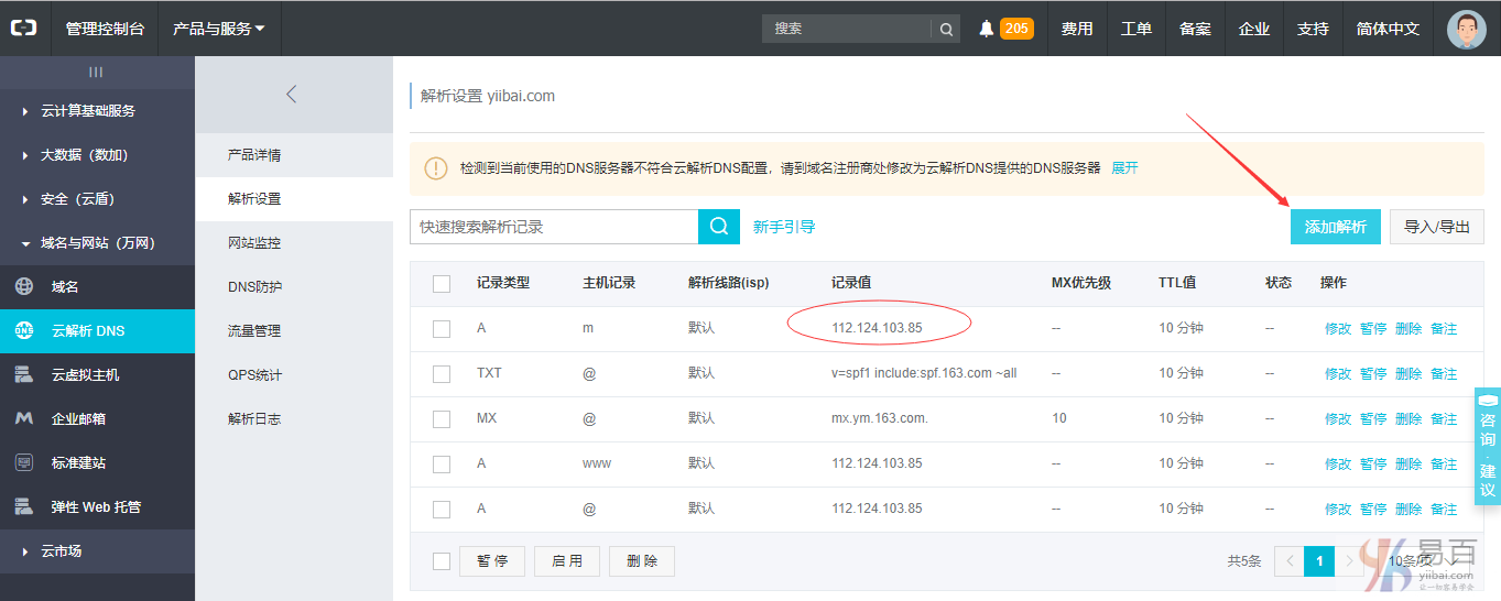 選擇你要解析的域名,然后點擊解析鏈接,轉(zhuǎn)到如下的界面 -