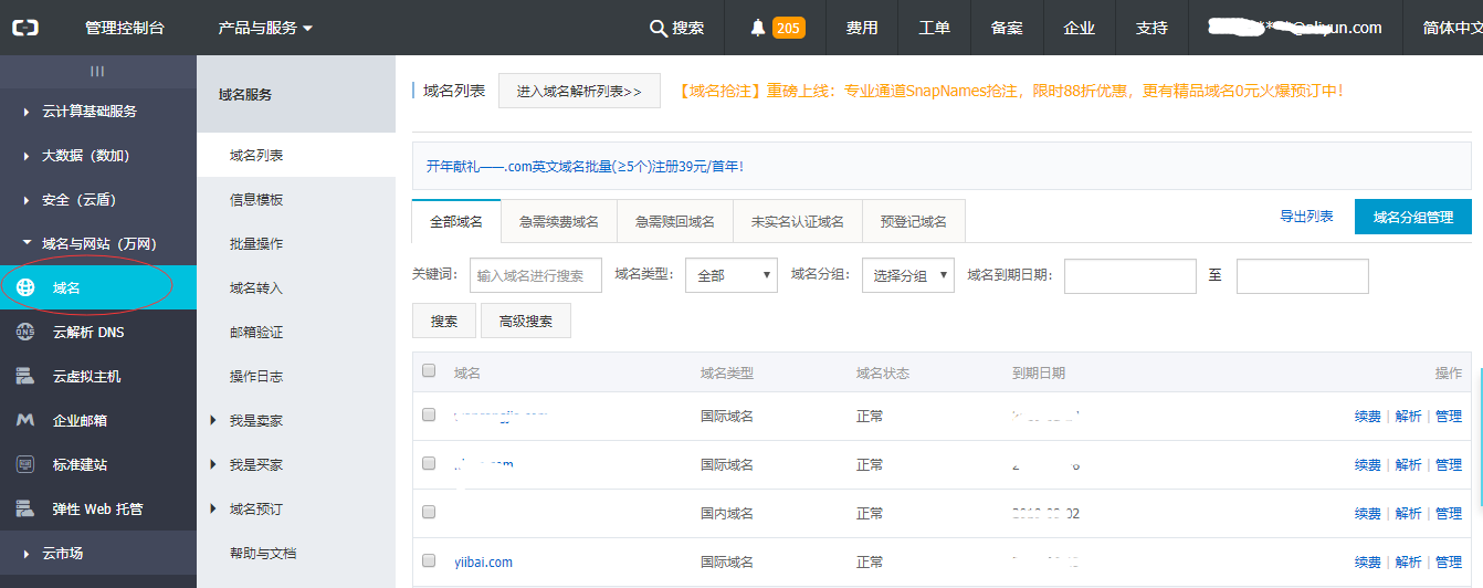 假設(shè)您已經(jīng)注冊了域名,并且成功安裝了博客系統(tǒng),對外公開的博客網(wǎng)站的必須工作就是要解析域名,首先登錄您的阿里云賬號,進入到控制臺,在側(cè)菜單項中找到域名和網(wǎng)站(萬網(wǎng)) -> 域名 ,如下所示 -